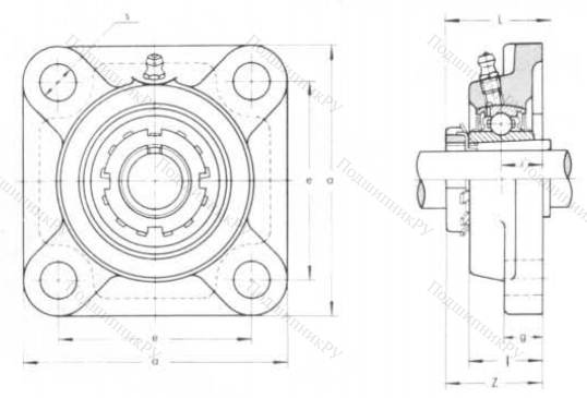 Данная шарикоподшипниковая серия оснащена квадратным чугунным, каучуковым или прессованным стальным фланцем, корпусом F-серии и подшипником UK-типа с закрепительной втулкой разновидности H.